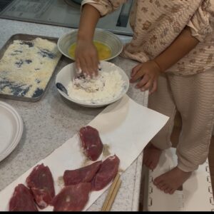 小さな手で、姉妹が協力して小麦粉や卵、パン粉で衣をつけてくれ、おかげでサクサクの美味しいとんかつを食べることができました。