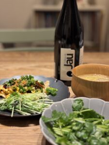 用意してくれてた、豚汁を温めて、とんぺい焼きと、パクチーサラダ🥗