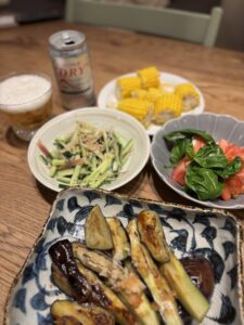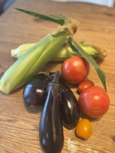 知り合いの農家さんにお願いして、子供たちと一緒に夏野菜の収穫体験をさせていただき、夏野菜もしっかりいただきました。